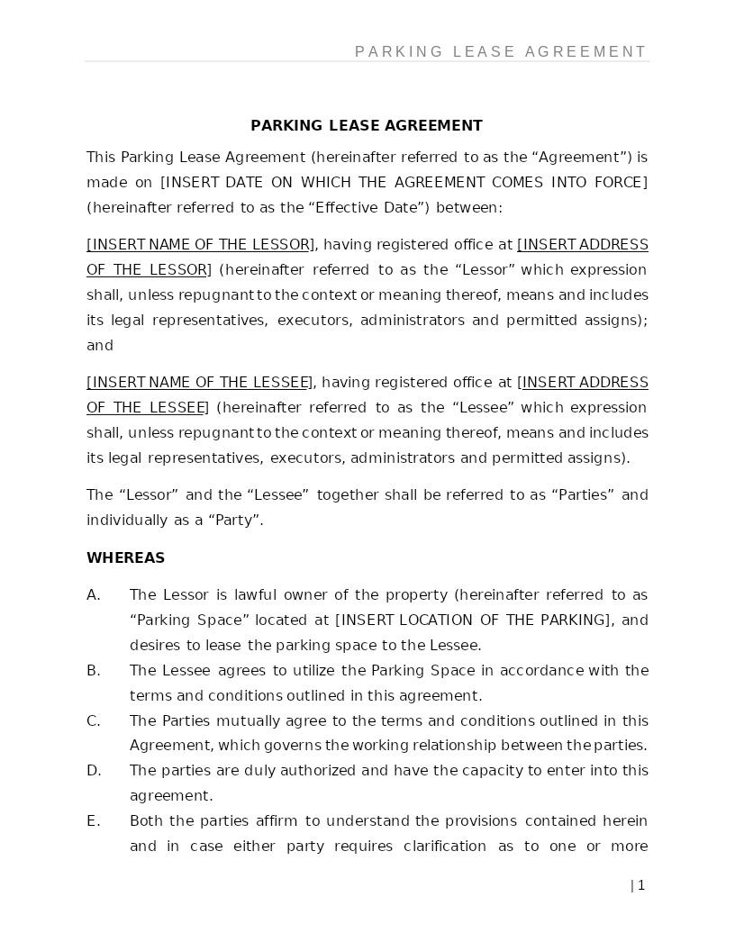 A Parking Lease Agreement is a legally binding contract that grants an individual or business the right to use a designated parking space for a specified period. It outlines key terms such as the location of the space, permitted use, access rights, rent amount, payment schedule, maintenance responsibilities, security rules, and what happens if either party violates the agreement.
