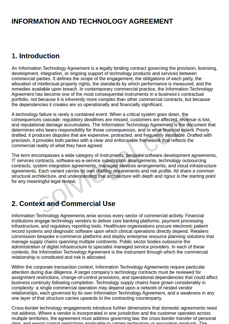 The Information Technology Agreement is a document whose apparent familiarity masks its legal complexity. Technology procurement has become routine in commercial life, and that routineness creates a tendency to treat the agreement as a standard-form instrument capable of execution with limited scrutiny. The consequences of that approach, loss of intellectual property rights, inadequate remedies for service failures, regulatory exposure from non-compliant data processing provisions, and operational dependency upon a vendor from whose contract there is no practical exit, are sufficiently serious to justify a different standard of engagement.